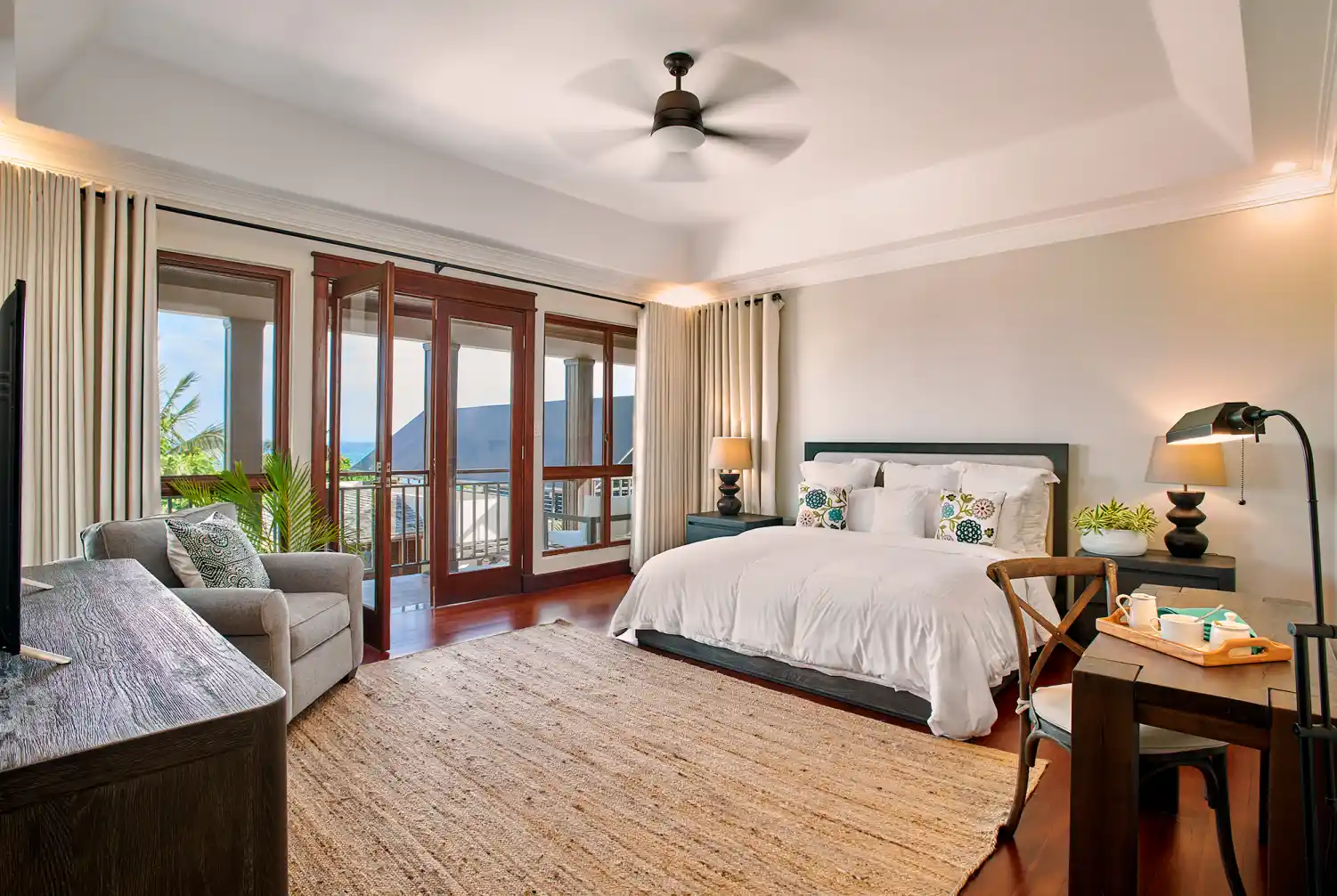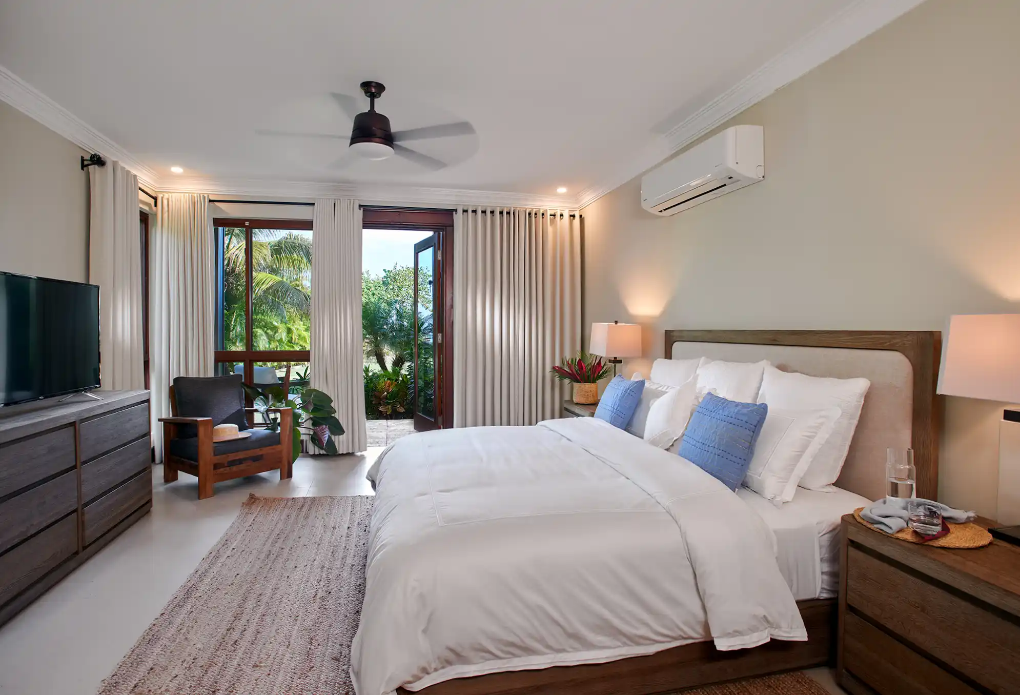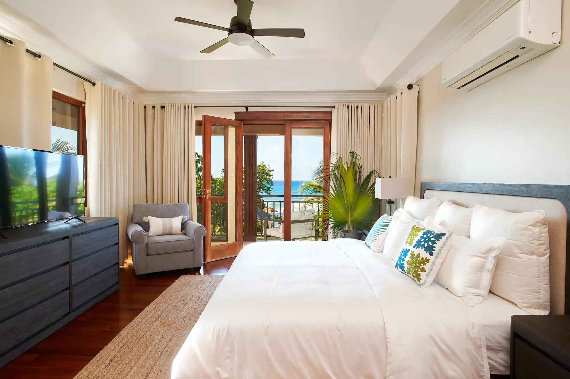King-size bed & walk-in closet area with French doors to private balcony overlooking the pool and beach. En-suite bathroom with walk-in shower.