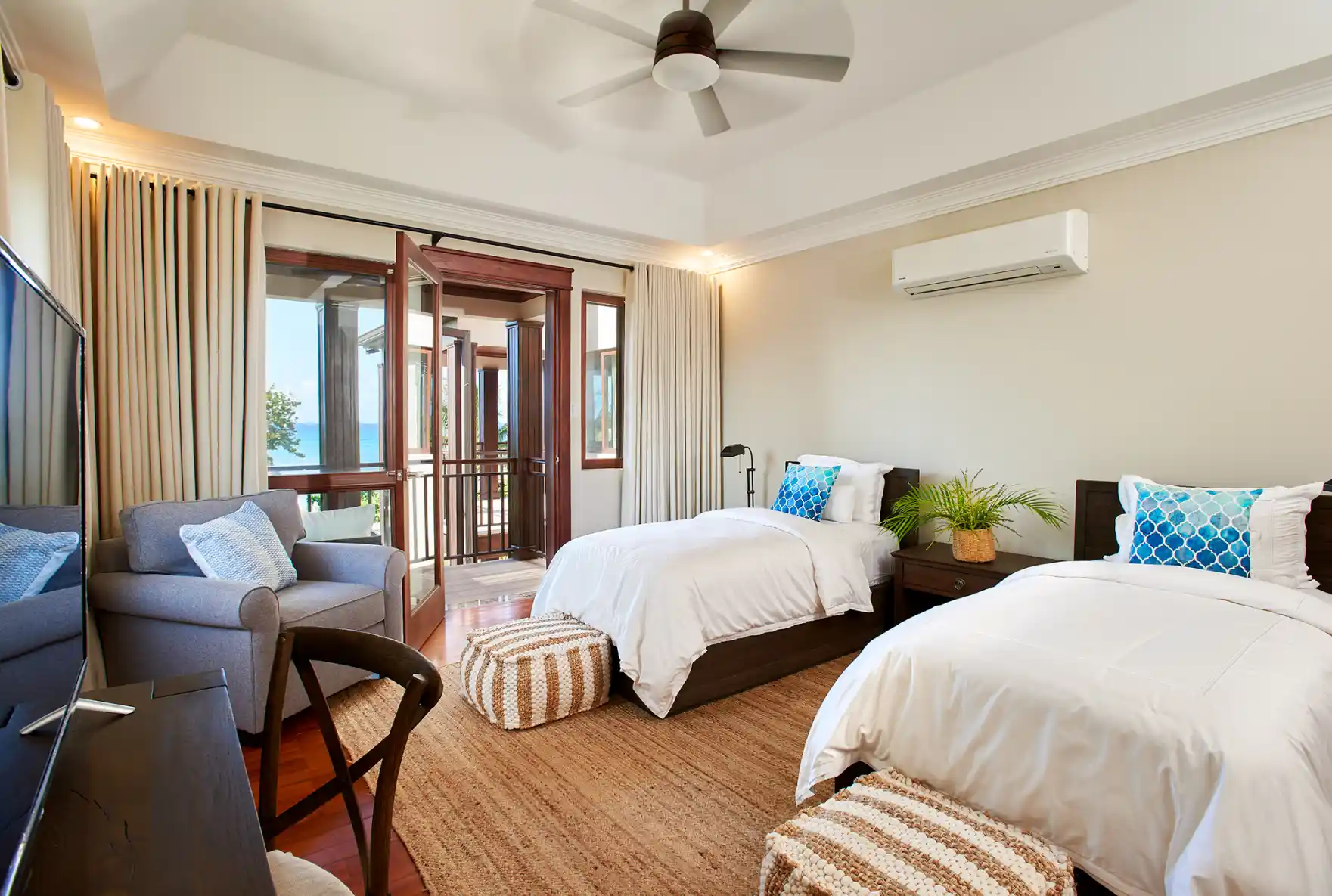 Each bedroom 1-6 features air conditioning, a ceiling fan, and a flat-screen 50” TV with cable access and a sea view. En-suite bathrooms with robes, bathroom amenities & safes. Bedroom 7 features air conditioning, a ceiling fan, and a flat-screen 50” TV with cable access and shares a bathroom with one of the other bedrooms.