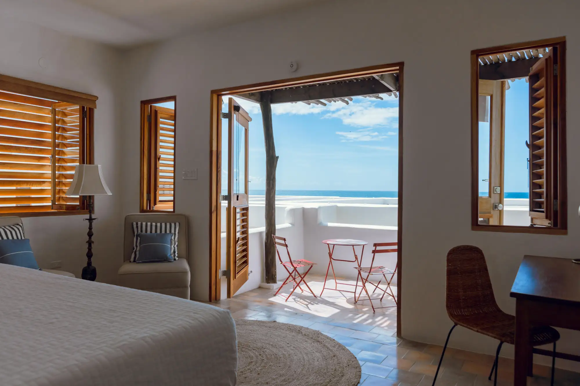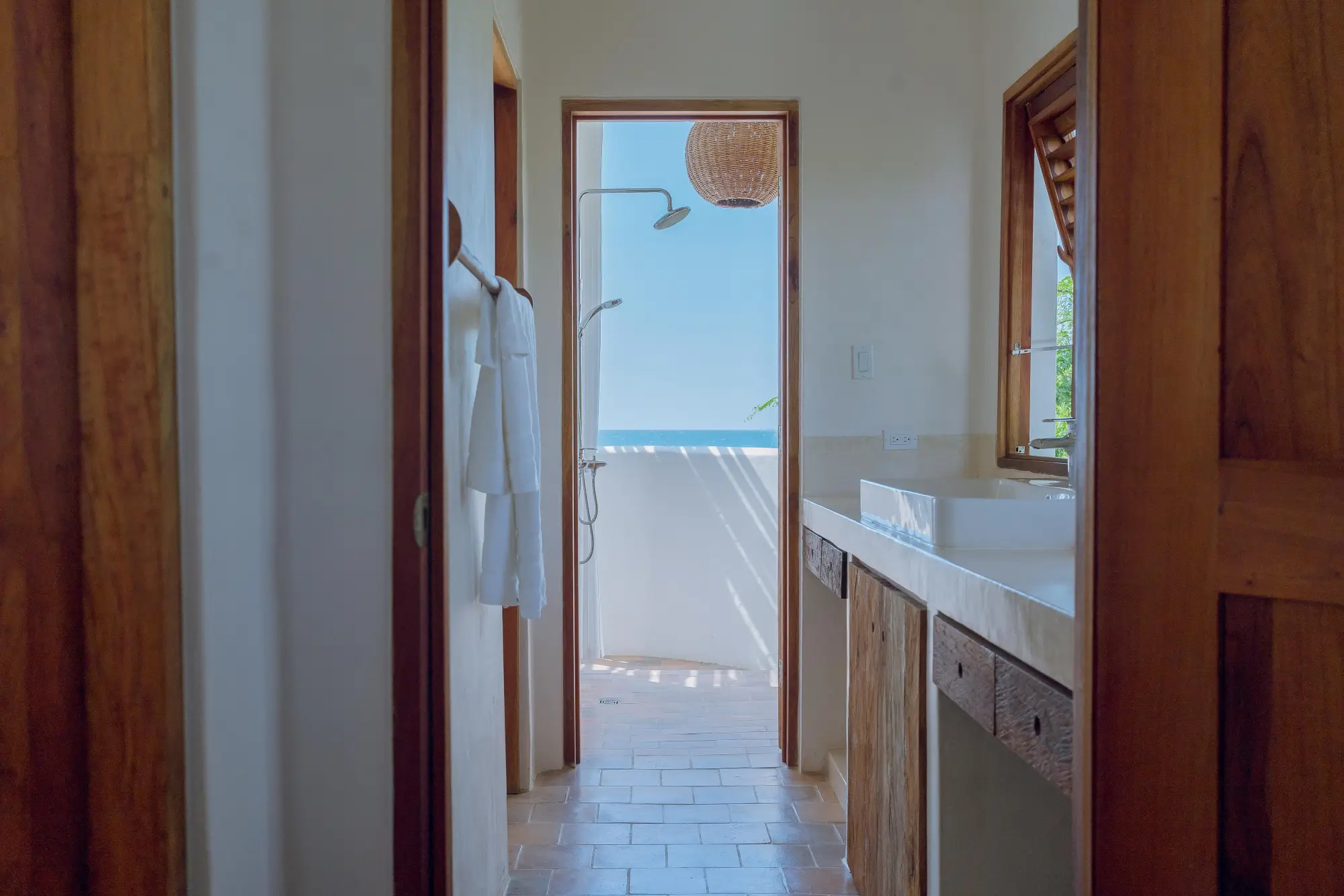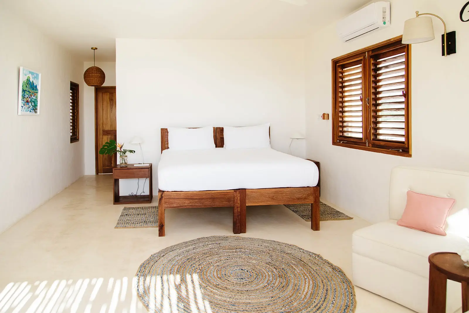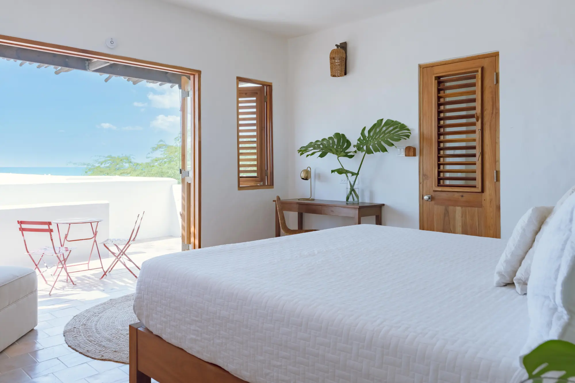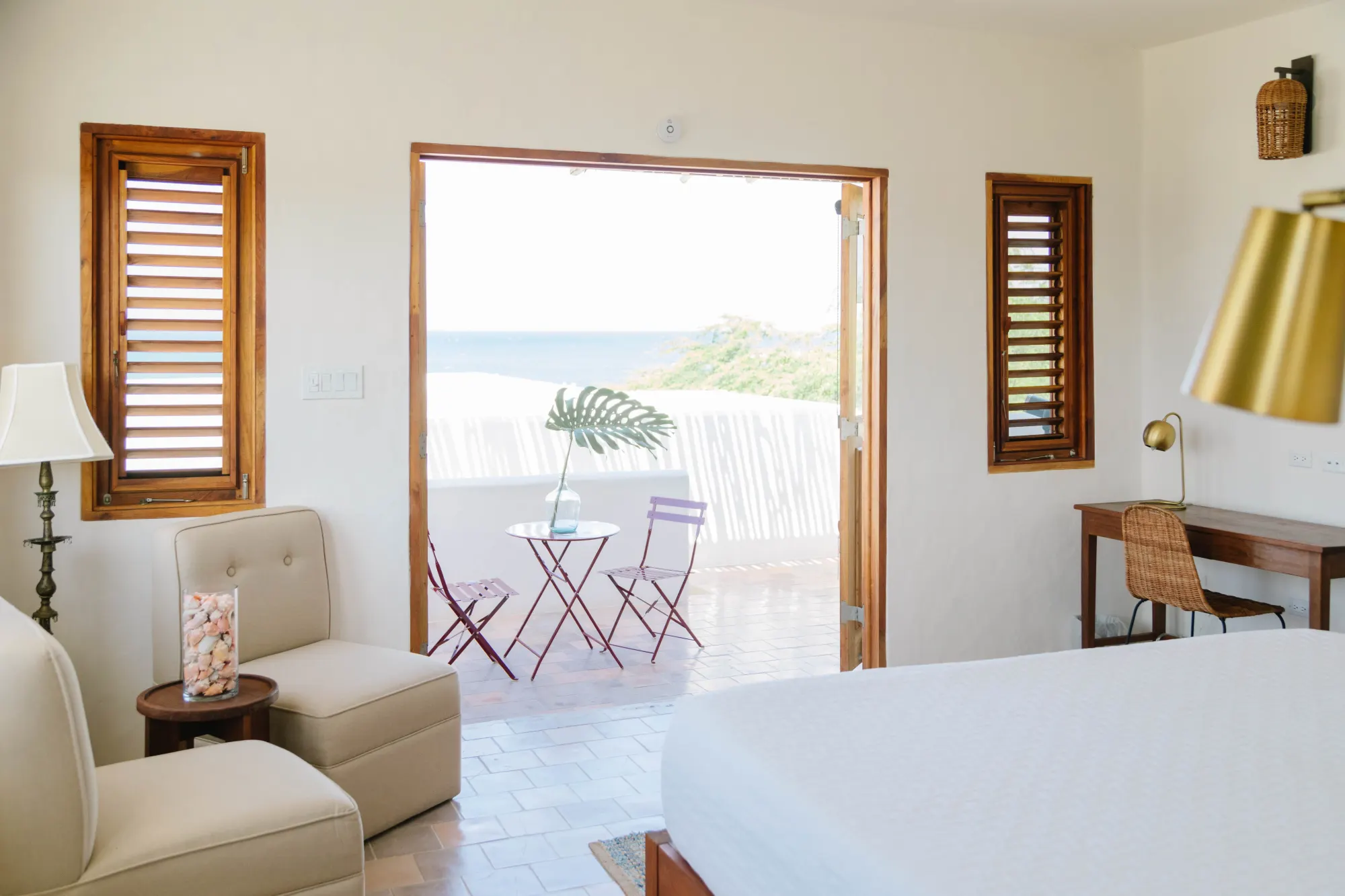 Two twin-size beds with XL mattresses, convertible to a king-size bed with a topper. AC, fans, and a flat-screen TV, doors to an ocean-view balcony. En-suite bathroom with walk-in shower and semi-outdoor shower.