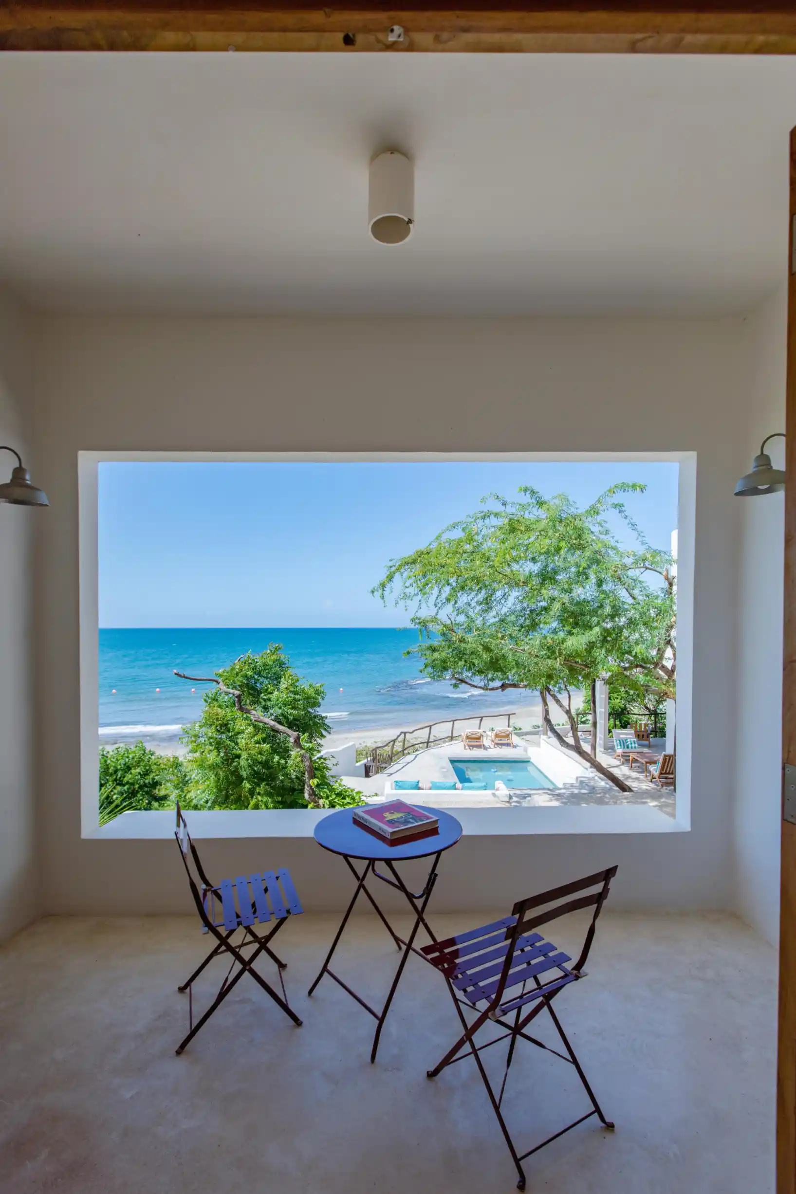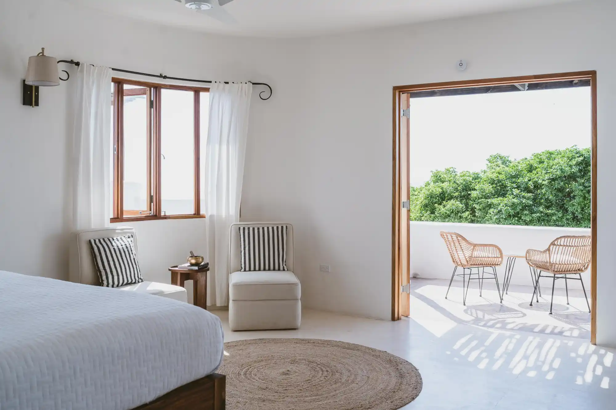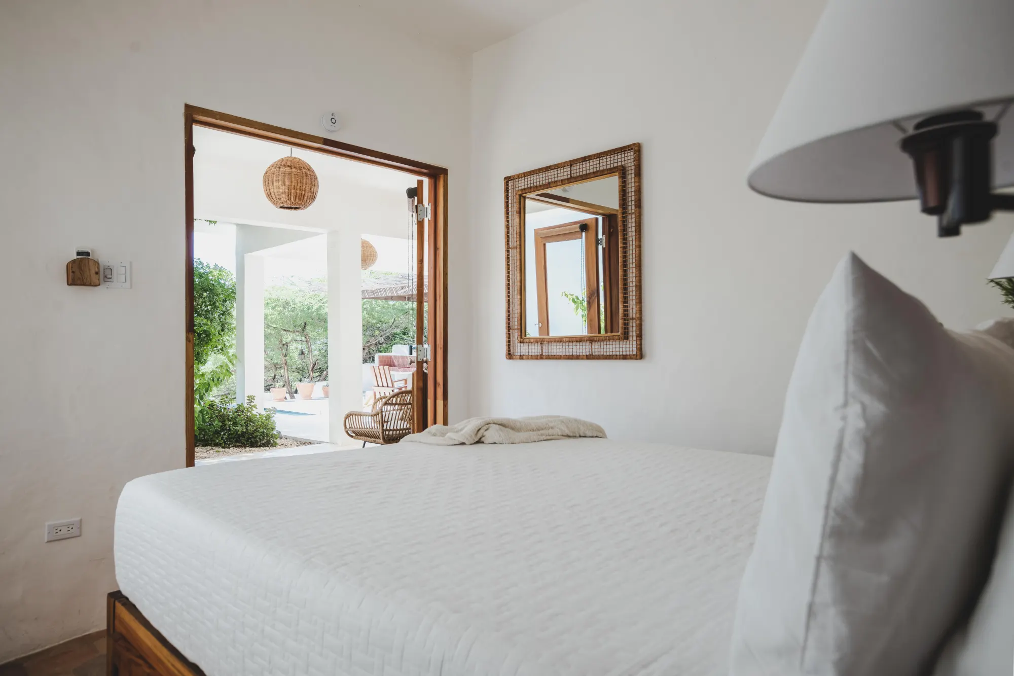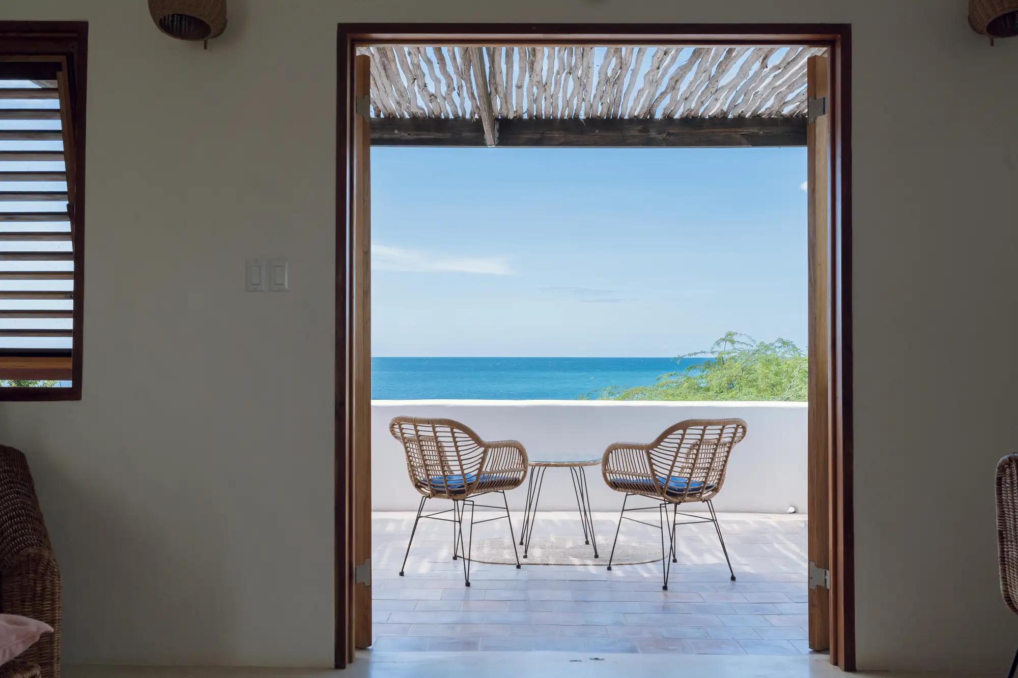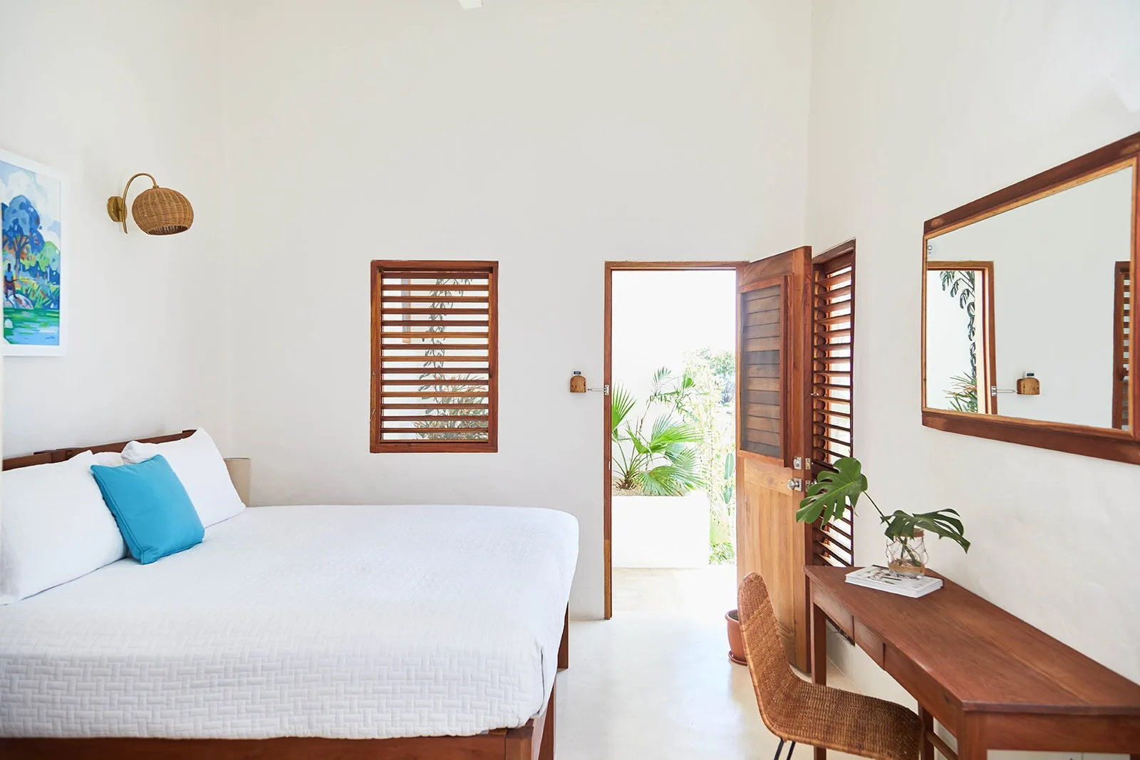 Two twin-size beds with XL mattresses, convertible to a king-size bed with a topper. AC, fans, and a flat-screen TV, doors to an ocean-view balcony. En-suite bathroom with walk-in shower and semi-outdoor shower.