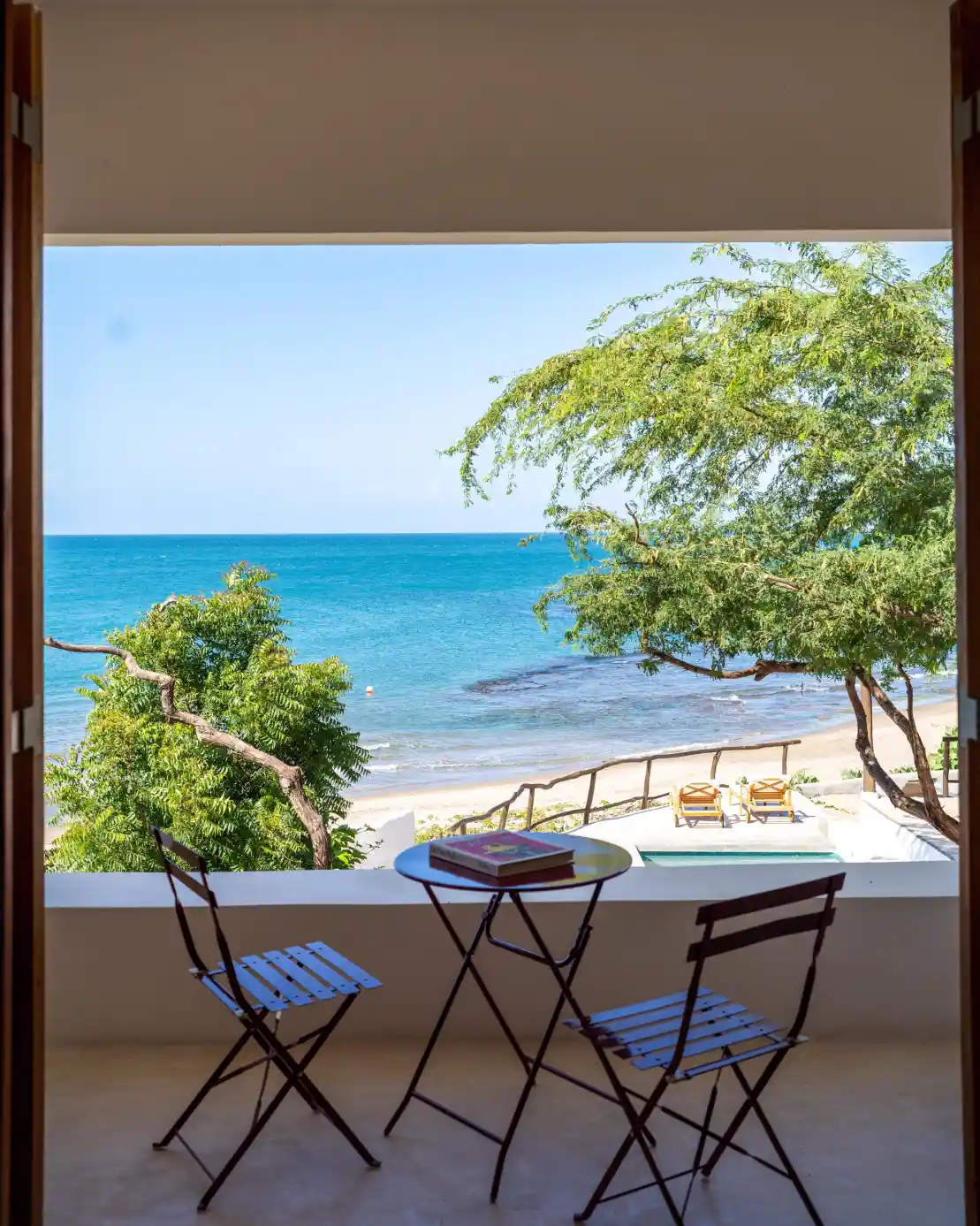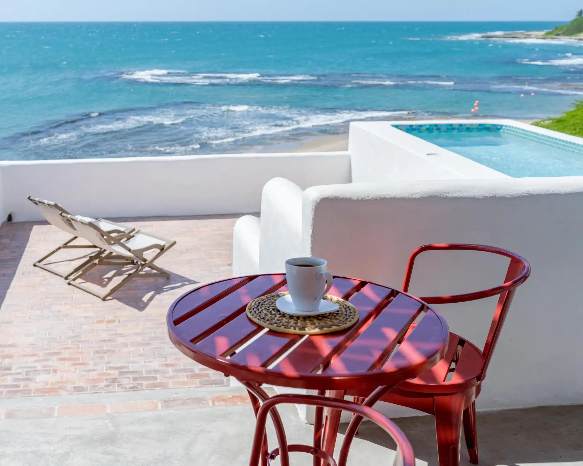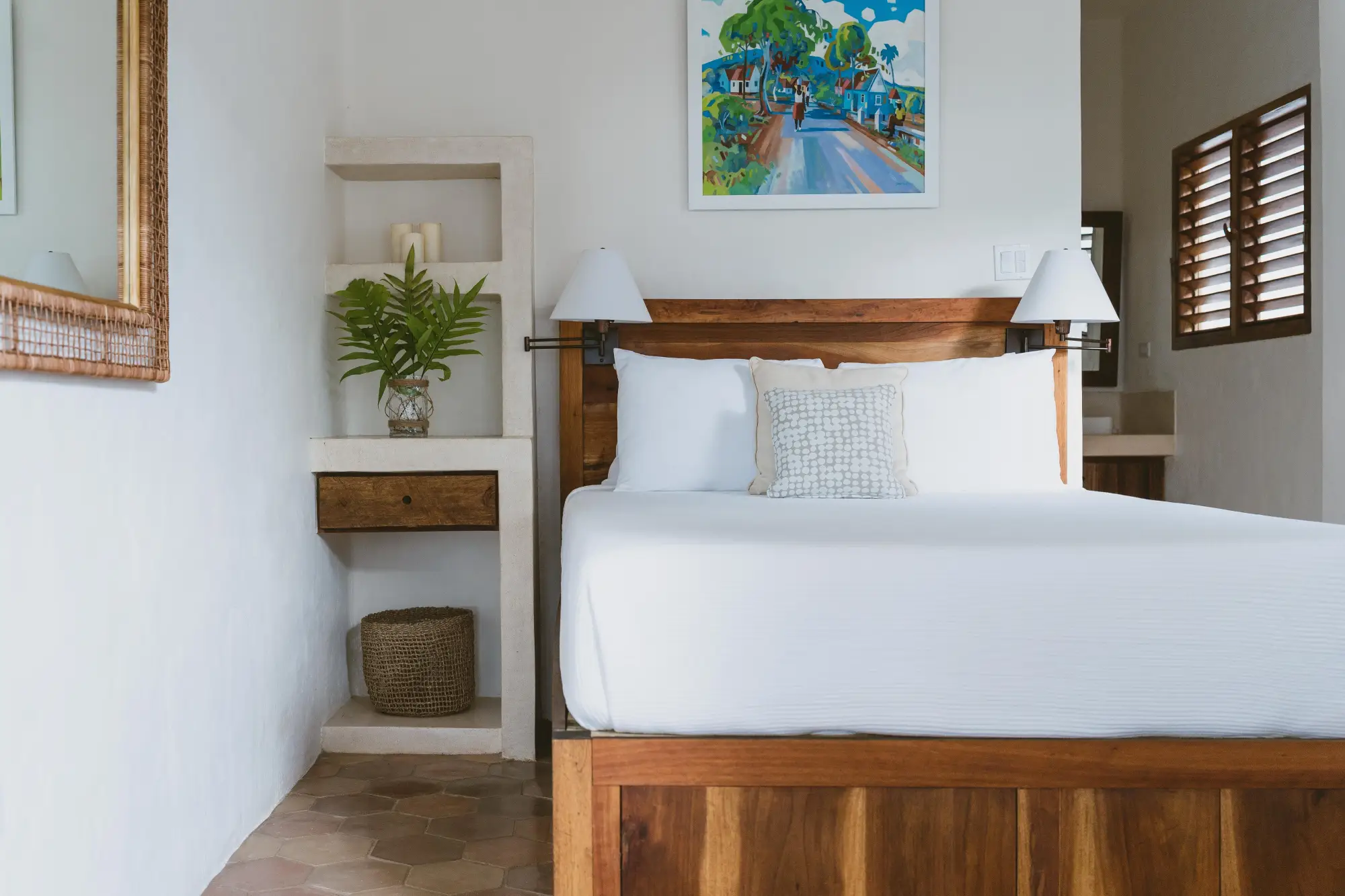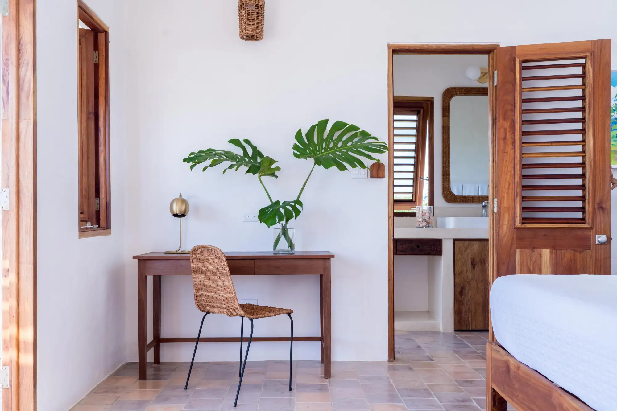 Two twin-size beds with XL mattresses, convertible to a king-size bed with a topper. AC, fans, and a flat-screen TV, doors to an ocean-view balcony. En-suite bathroom with walk-in shower and semi-outdoor shower.