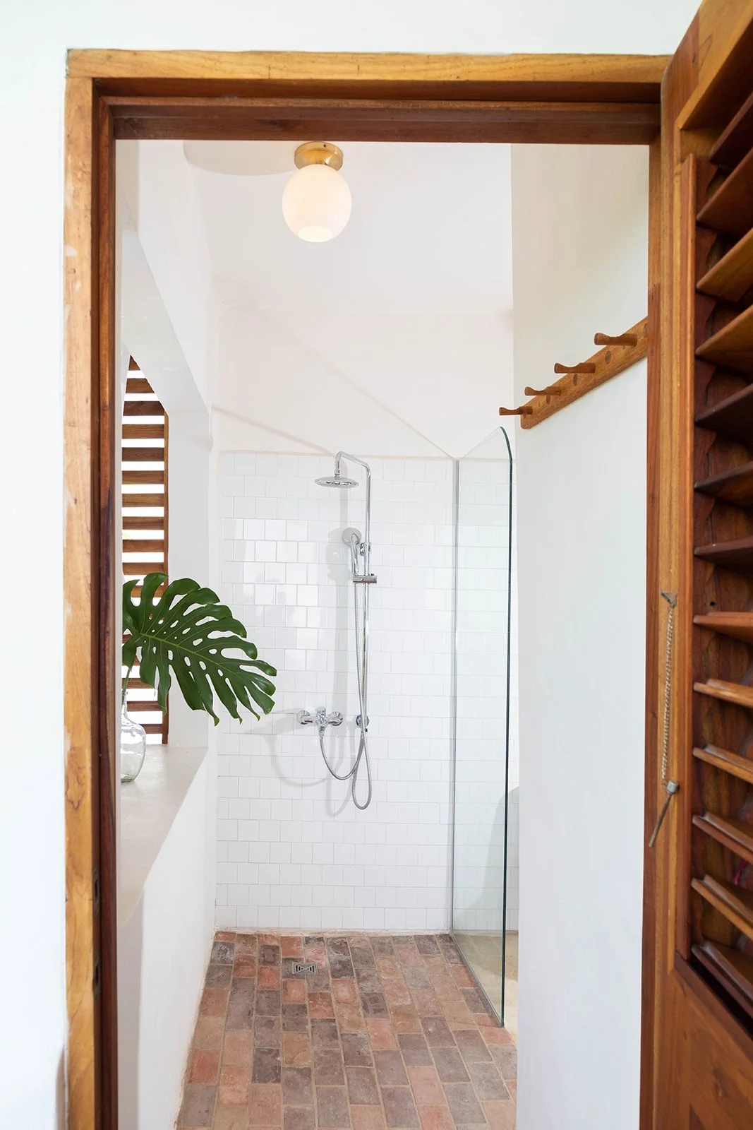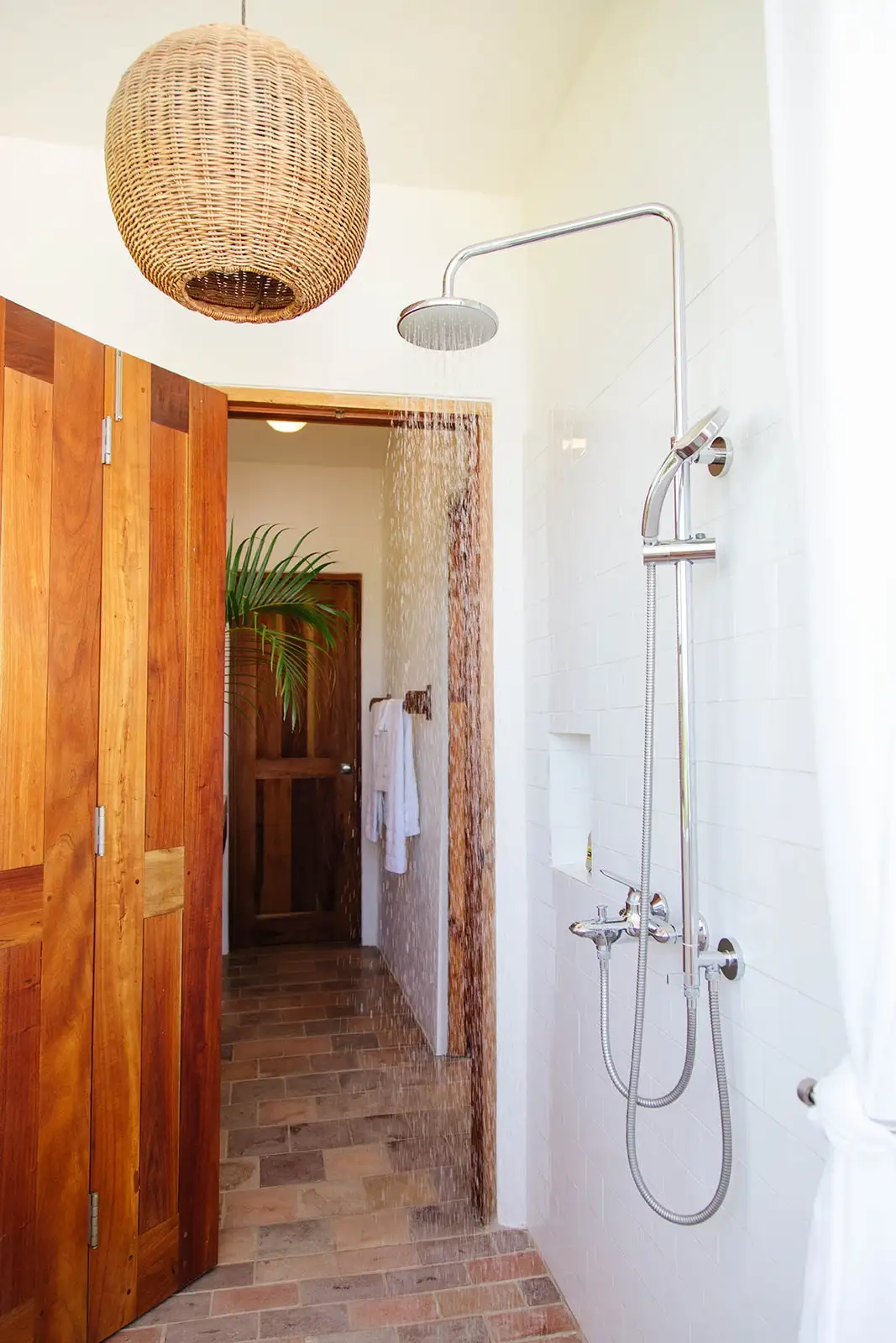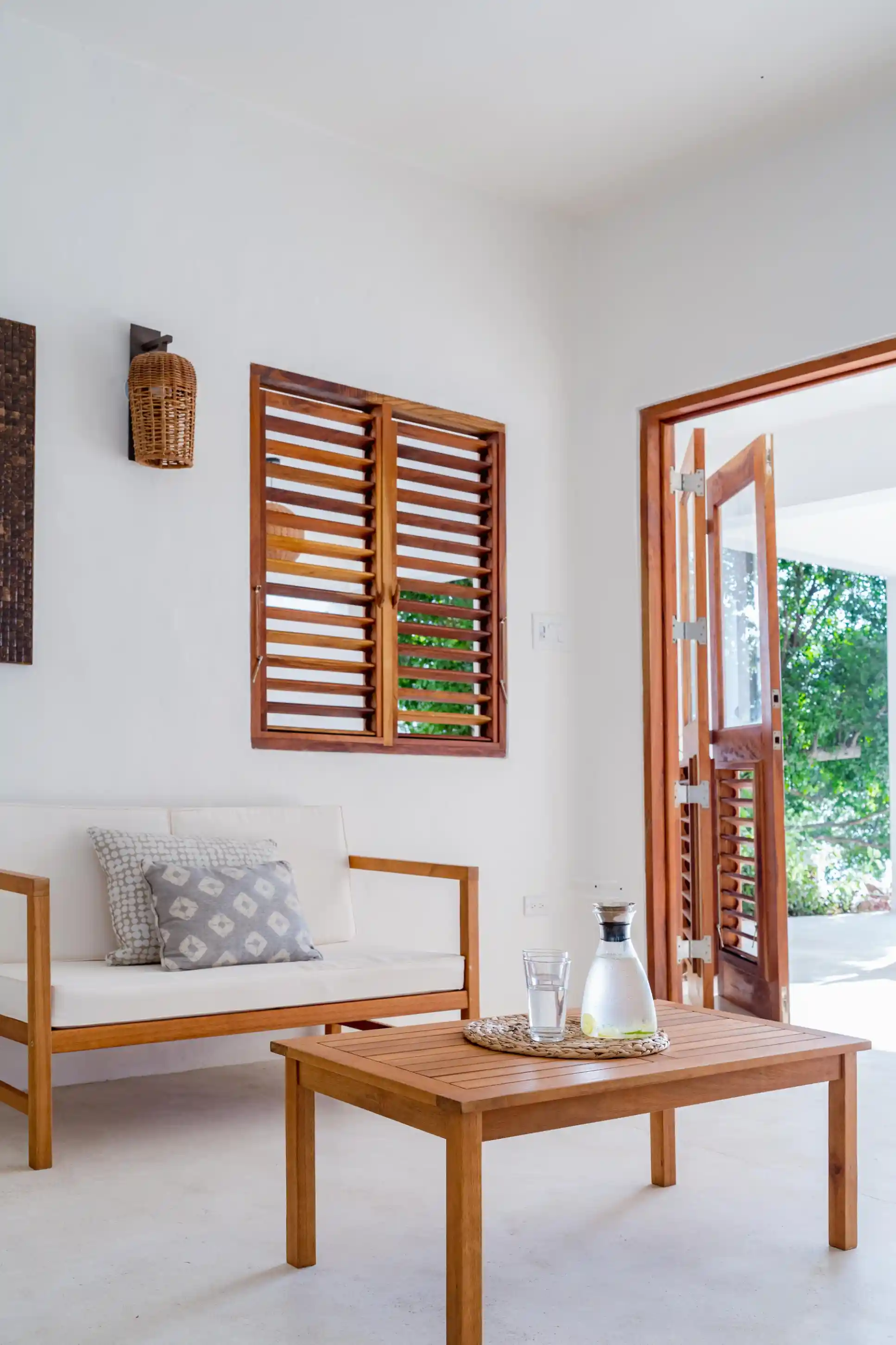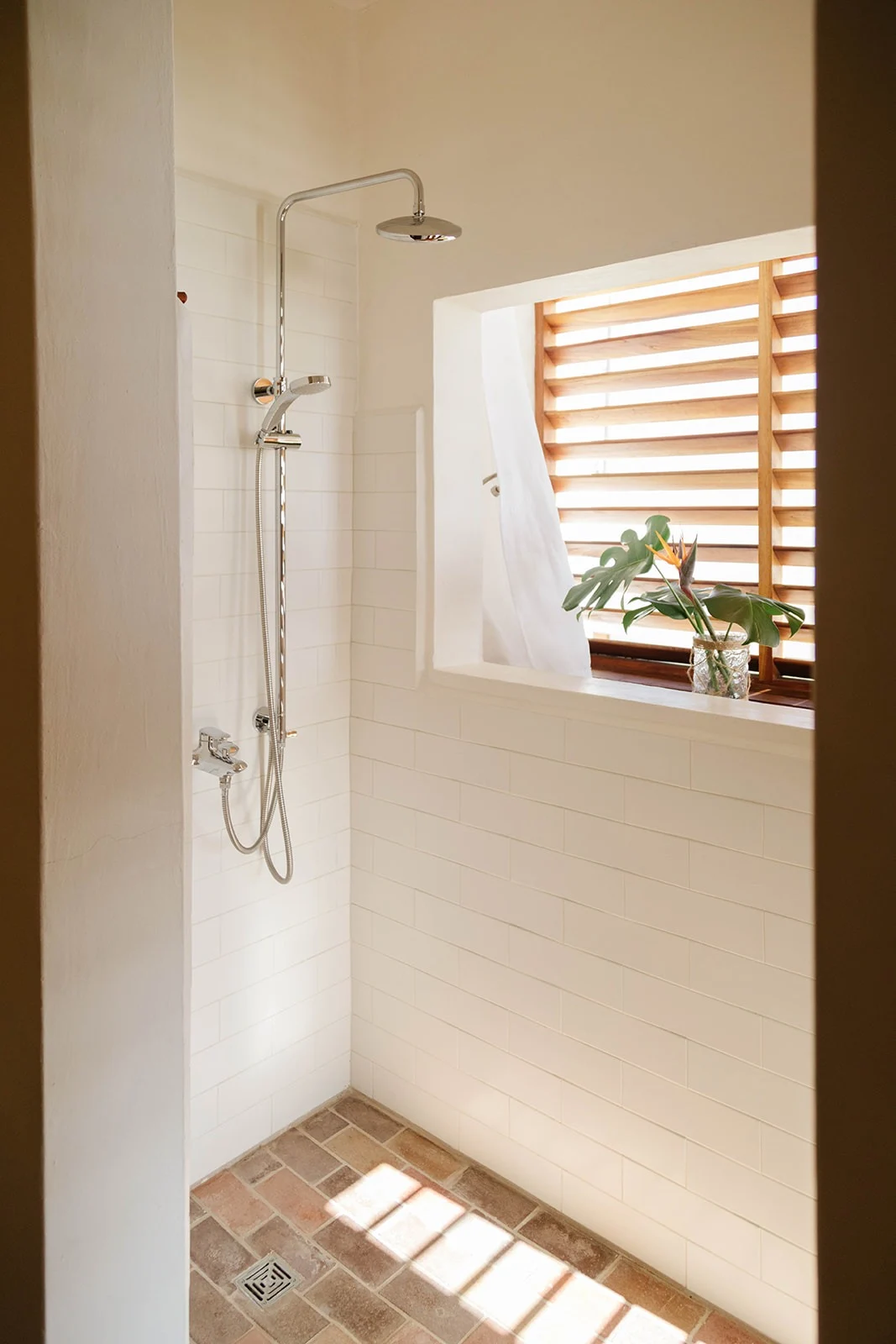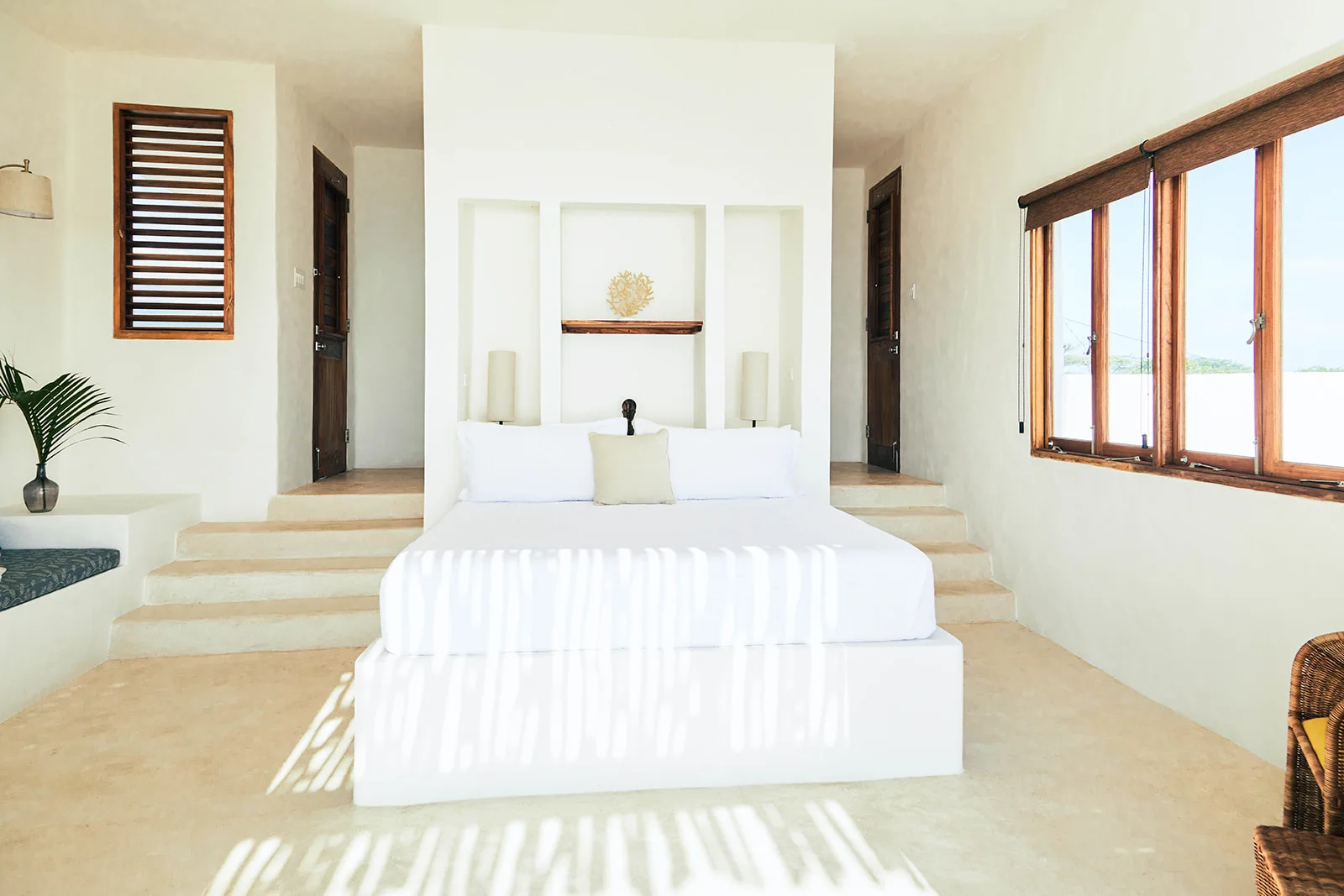 Two twin-size beds with XL mattresses, convertible to a king-size bed with a topper. AC, fans, and a flat-screen TV, doors to an ocean-view balcony. En-suite bathroom with walk-in shower and semi-outdoor shower.