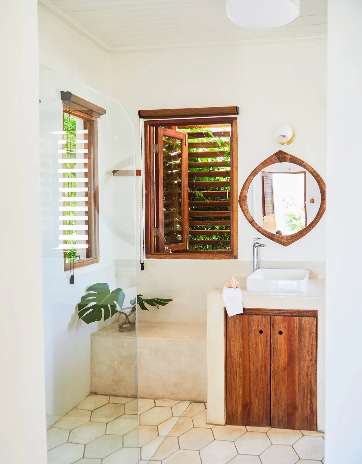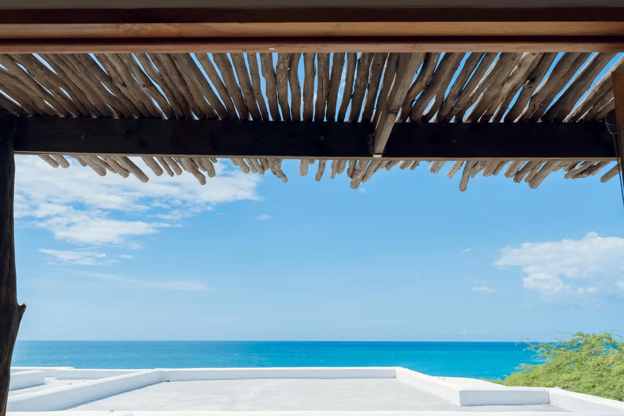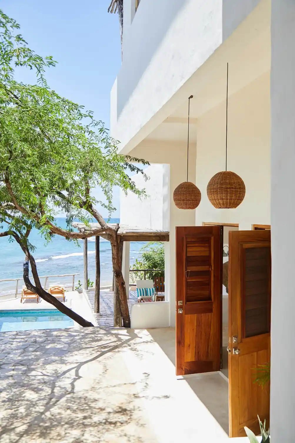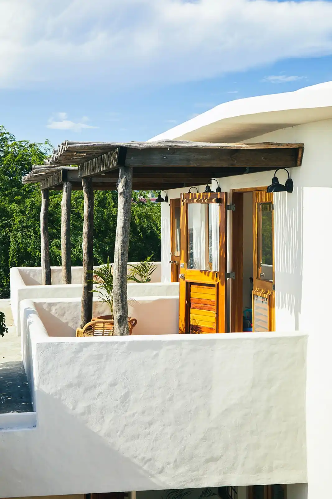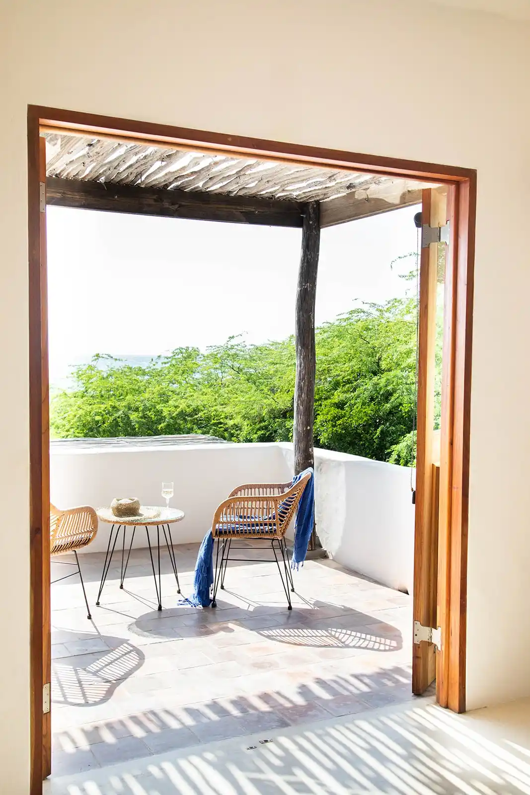 Two twin-size beds with XL mattresses, convertible to a king-size bed with a topper. AC, fans, and a flat-screen TV, doors to an ocean-view balcony. En-suite bathroom with walk-in shower and semi-outdoor shower.