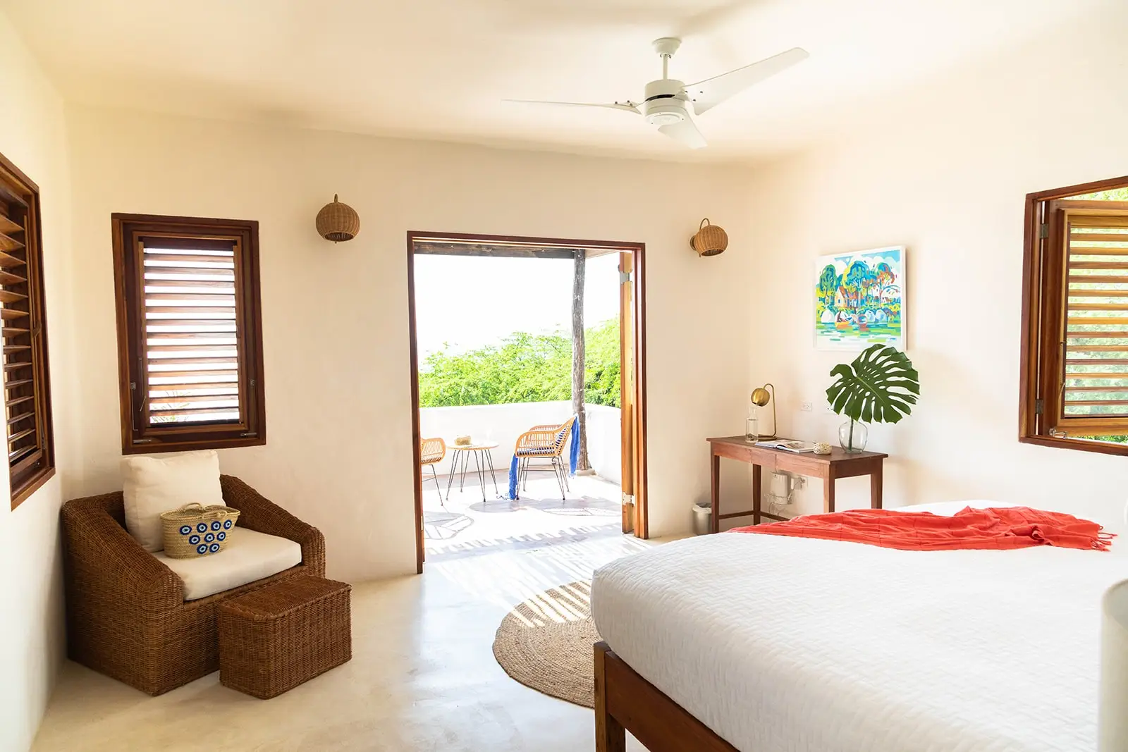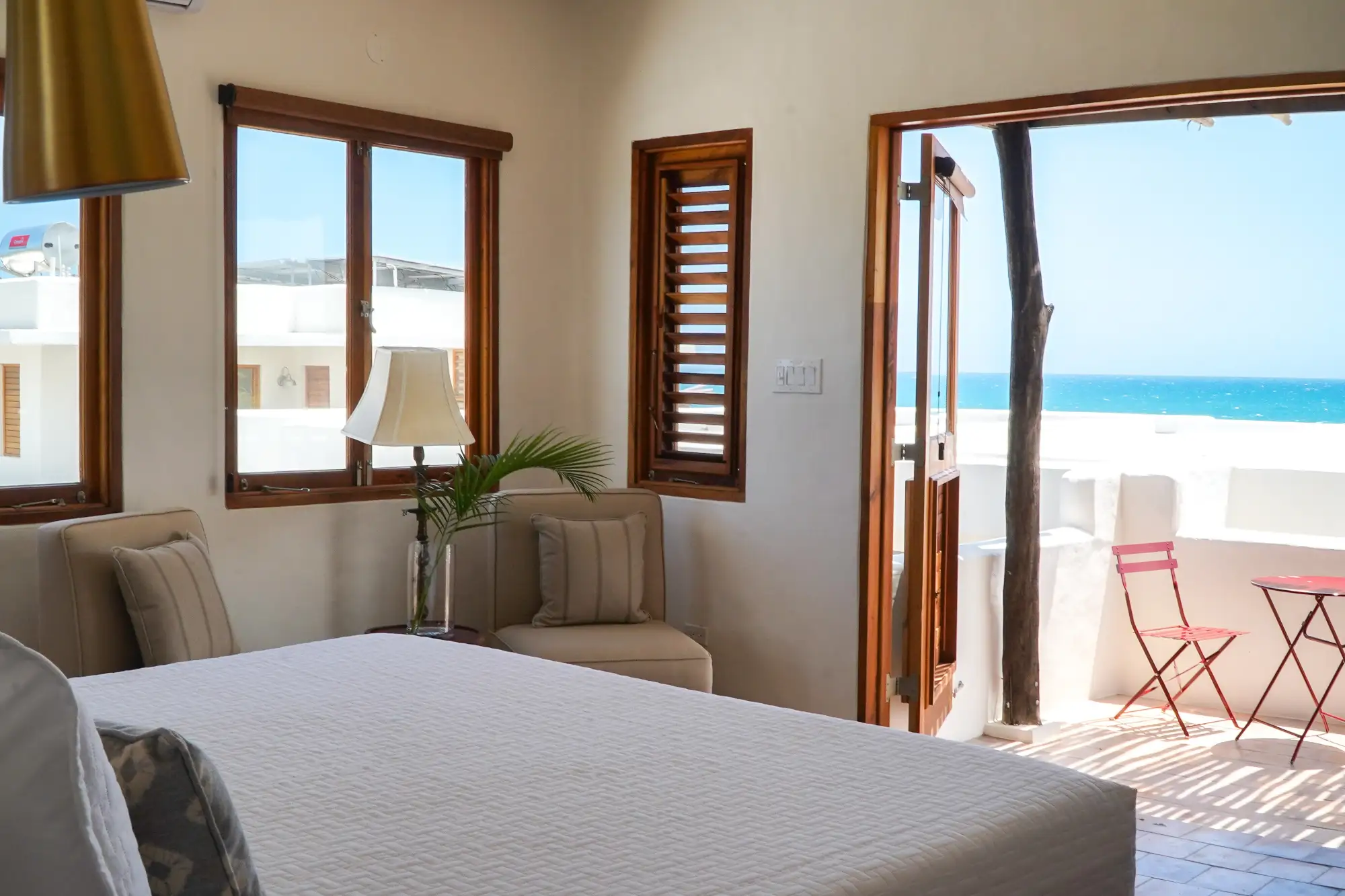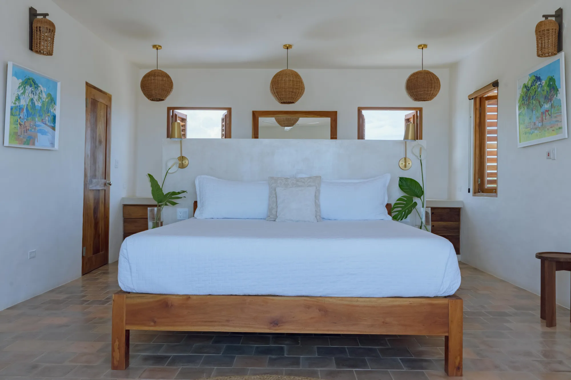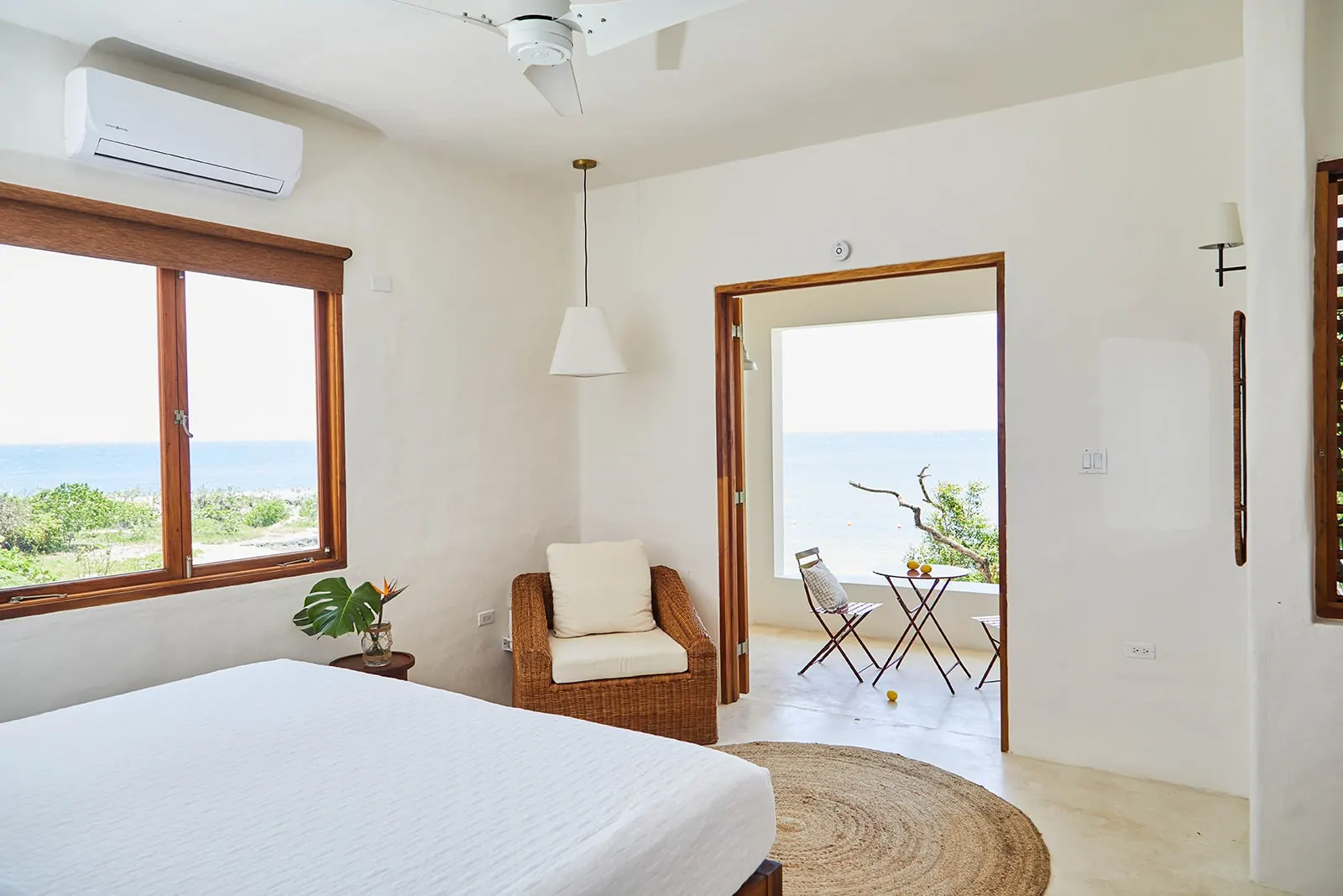 Two twin-size beds with XL mattresses, convertible to a king-size bed with a topper. AC, fans, and a flat-screen TV, ocean-view balcony. En-suite bathroom with walk-in shower and outdoor shower.