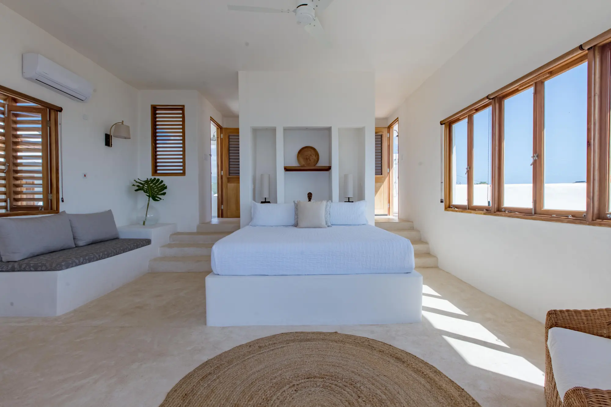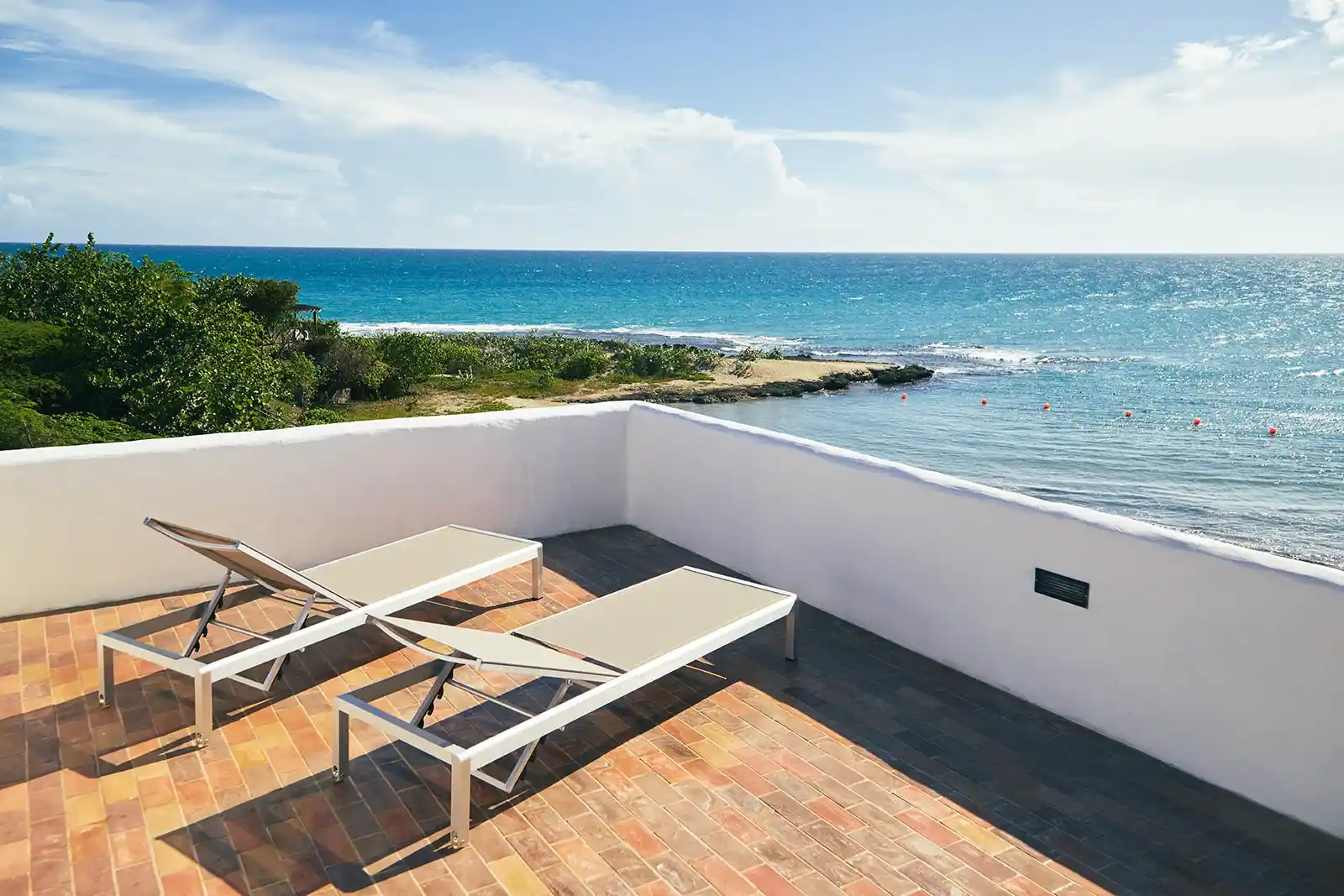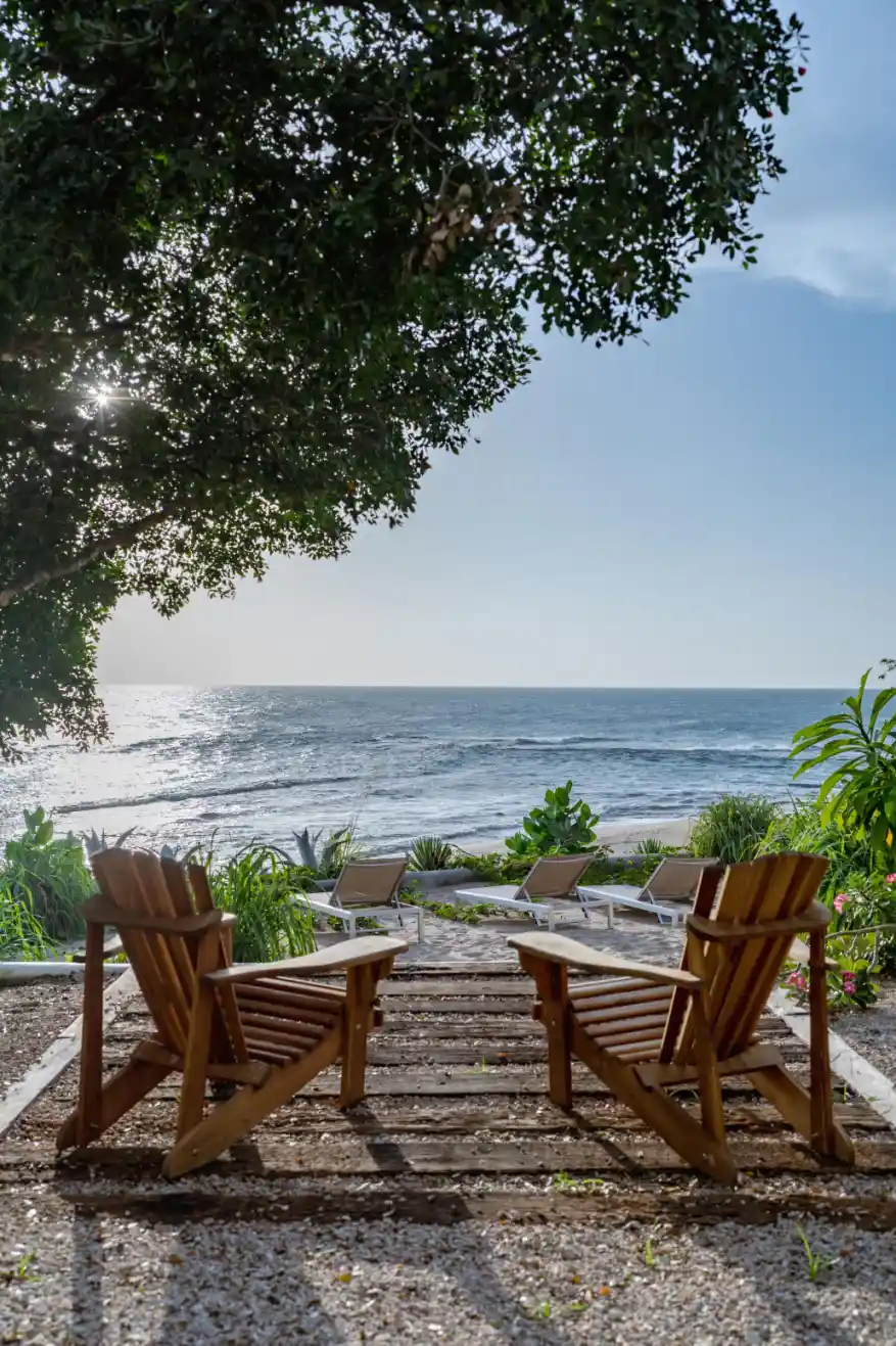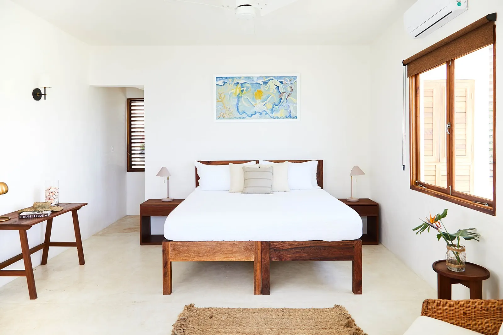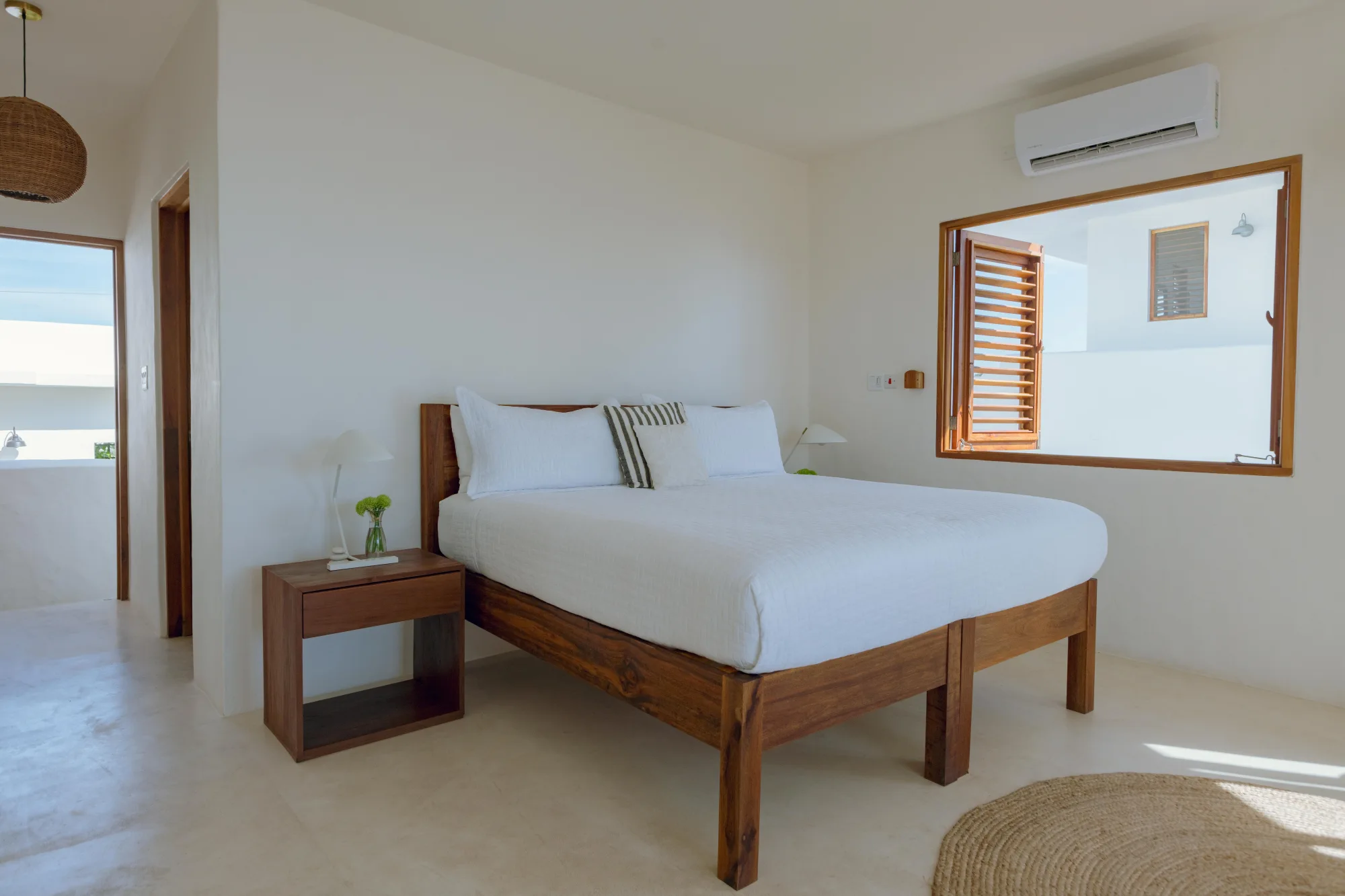 Two twin-size beds with XL mattresses, convertible to a king-size bed with a topper. AC, fans, and a flat-screen TV, ocean-view balcony. En-suite bathroom with walk-in shower and outdoor shower.