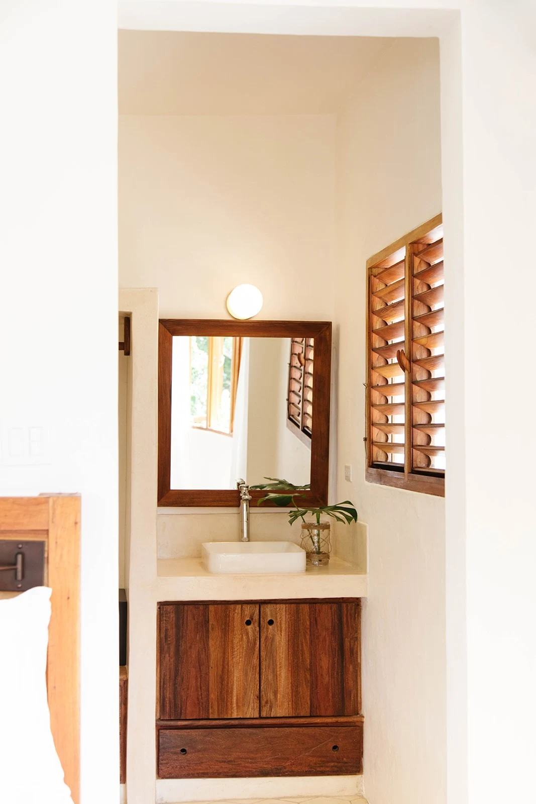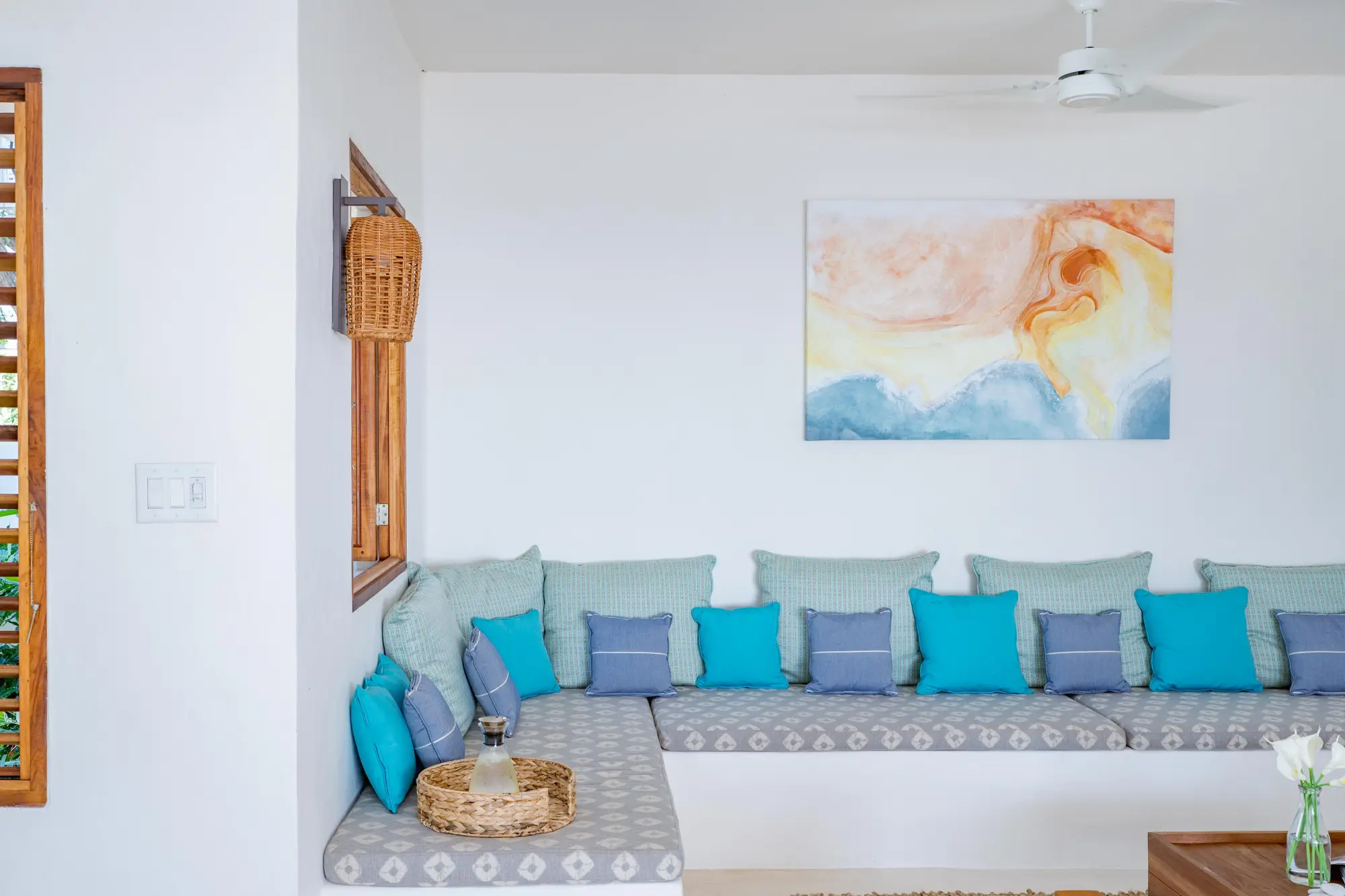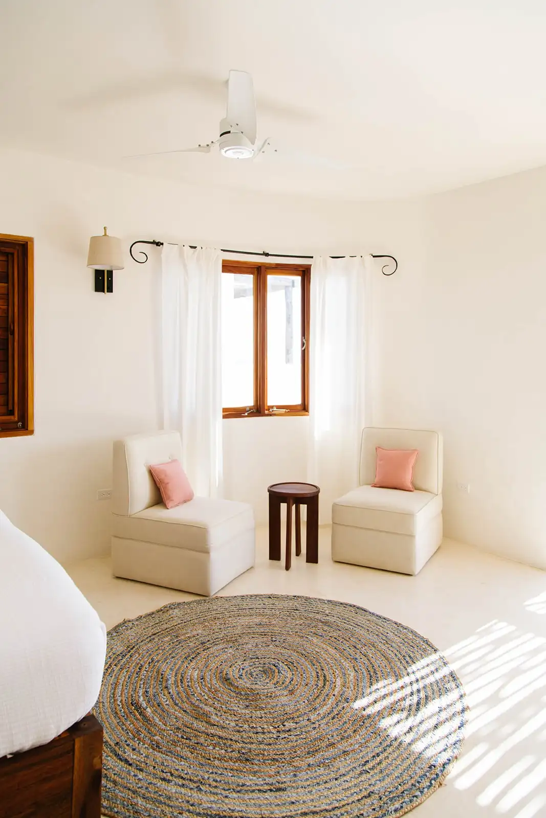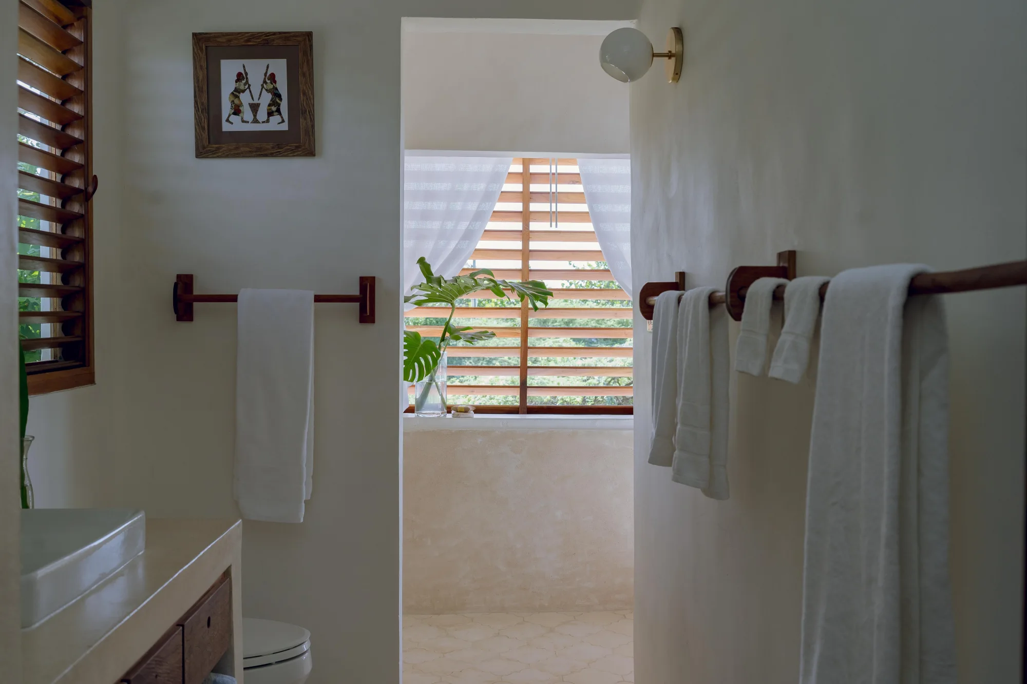 Two twin-size beds with XL mattresses, convertible to a king-size bed with a topper. AC, fans, and a flat-screen TV, ocean-view balcony. En-suite bathroom with walk-in shower and outdoor shower.