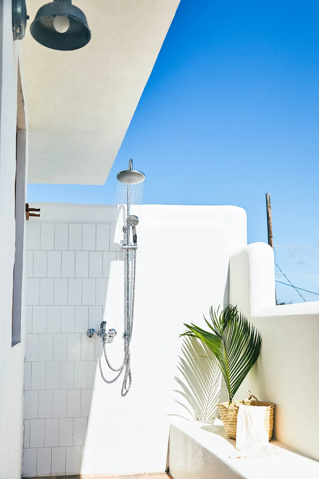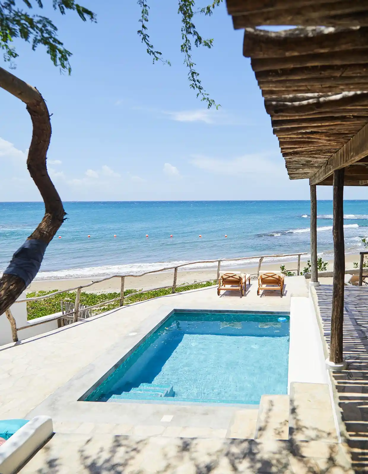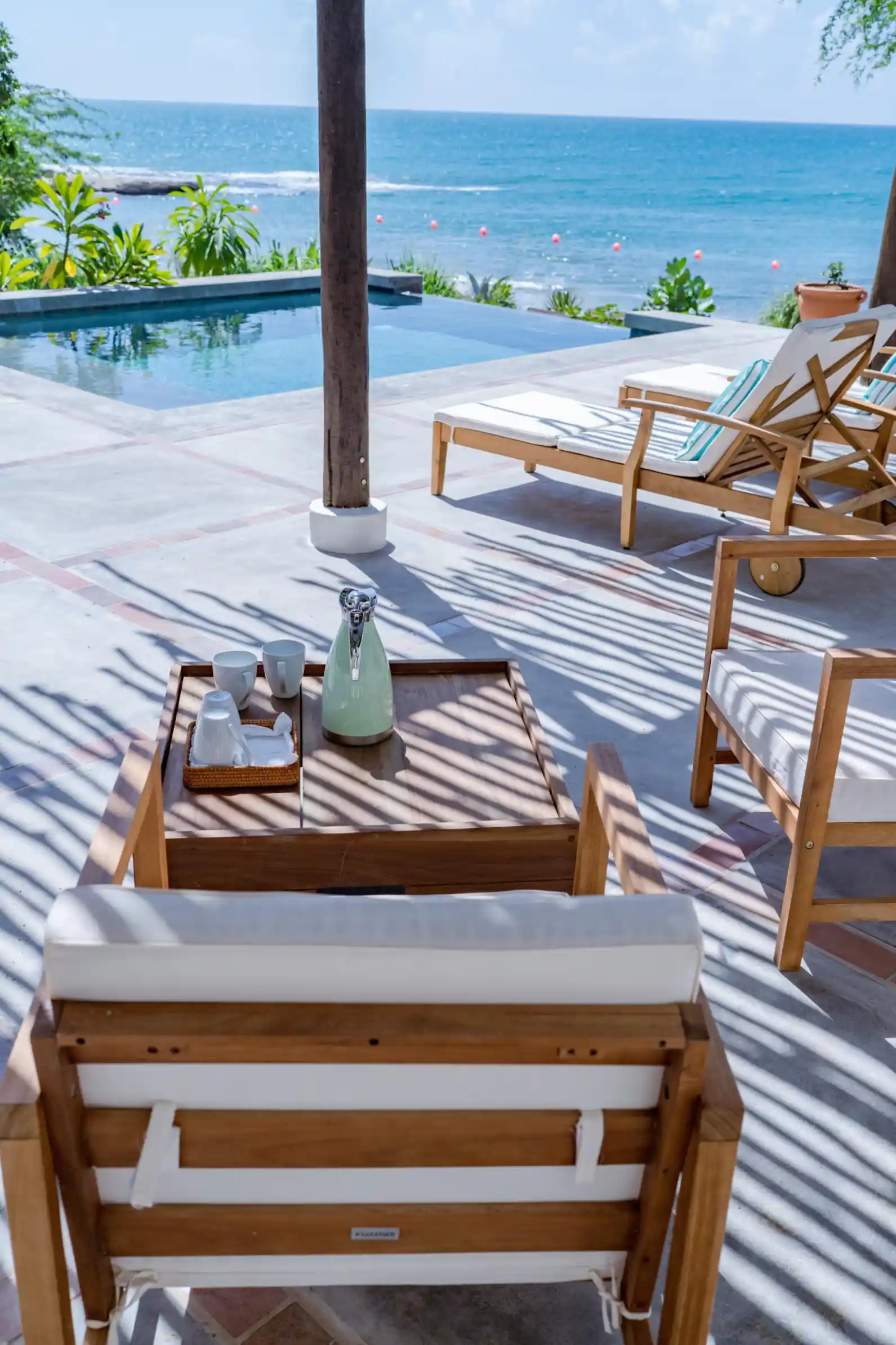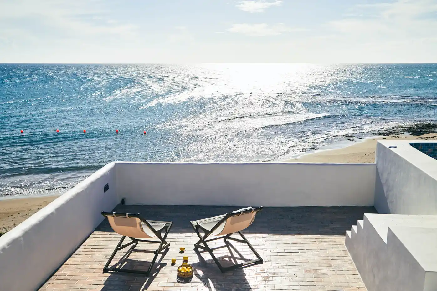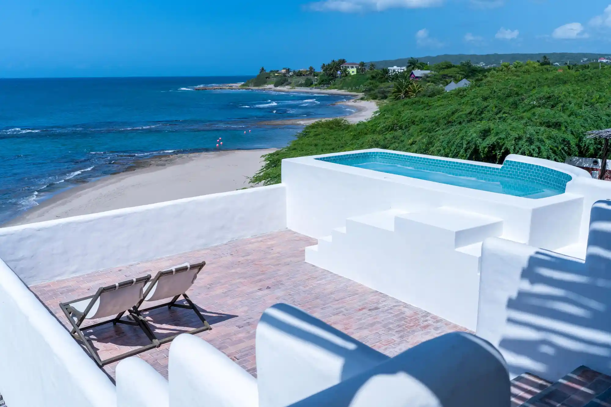 King-size bed with AC, fans, and flat-screen TV, doors to ocean view terrace with its own plunge pool, and private sunbathing deck overlooking the sea. En-suite bathroom, walk-in shower, and a second terrace with an outdoor shower