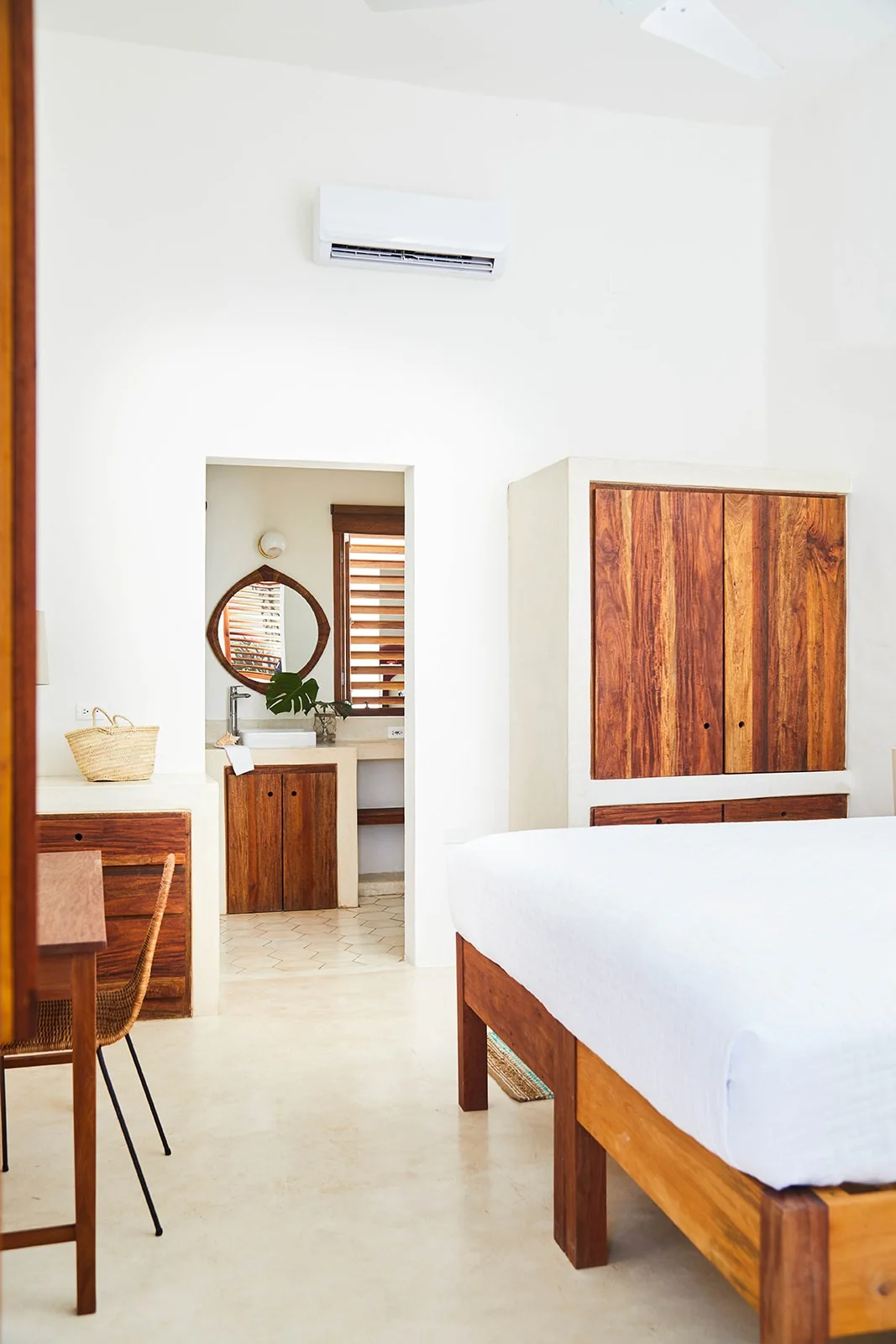 Two twin-size beds with XL mattresses, convertible to a king-size bed with a topper (perfect for either double or single occupancy). AC, fans, and a flat-screen TV. En-suite bathroom with walk-in shower.